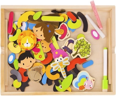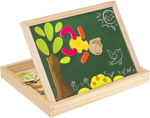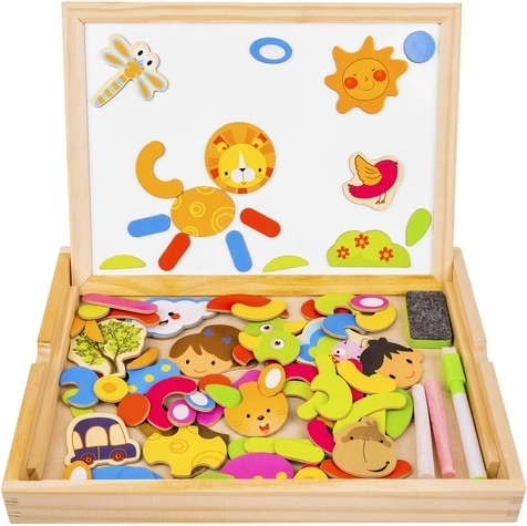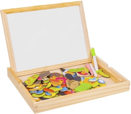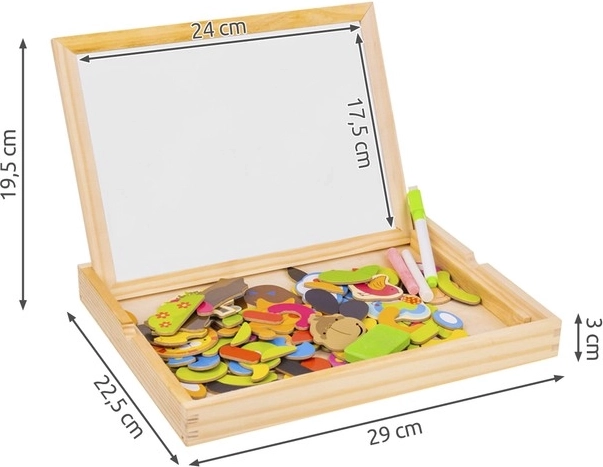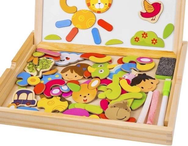 Giv dine børn timers sjov og kreativ læring med denne træ-magnetiske tavle! Tavlen tilbyder to sider: sort til tegning med kridt og hvid til skrift med tusch eller arrangering af magnetiske billeder. Med et hæfte med eksempler kan børn skabe forskellige mønstre og motiver.