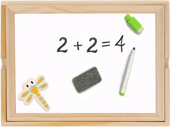 Tavlen tilbyder to forskellige overflader - en hvid til skrift med tusch og en sort til tegning med kridt, hvilket giver forskellige måder til kreativ leg.