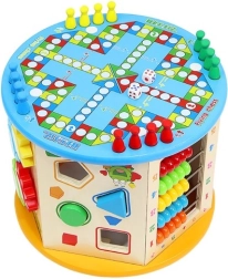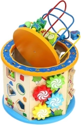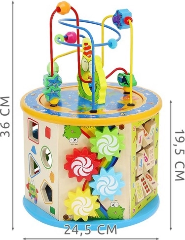 Oplev den alsidige træpædagogiske aktivitetskube 8i1, som byder på mange timers underholdning og samtidig udvikler finmotorik, logisk tænkning samt kendskab til farver, former og tal. Den farverige kuglebane på toppen, formesorteren, tandhjulene, kuglerammen, uret og spillepladen gør denne stabile legetøjskube til et ideelt valg til lærerig leg.