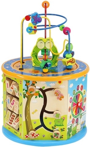 Denne interaktive træ-kube forener læring og leg i ét. Barnet øver at tælle, at skelne farver og former, tidsforståelse med uret samt hånd–øje-koordination via kuglelabrint og bevægelige dele. De glade illustrationer og den robuste trækvalitet fremmer kreativitet og sikker leg.