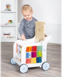 Gåvognen kombinerer flere aktiviteter som labyrint, puslespil og tegnebræt, der understøtter børns færdigheder.