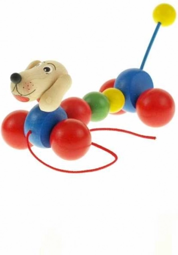 Glad lille hund i træ, som logrer med halen under bevægelse, vil glæde børn i alle aldre. Den er lavet af kvalitetstræ og har et farverigt design.