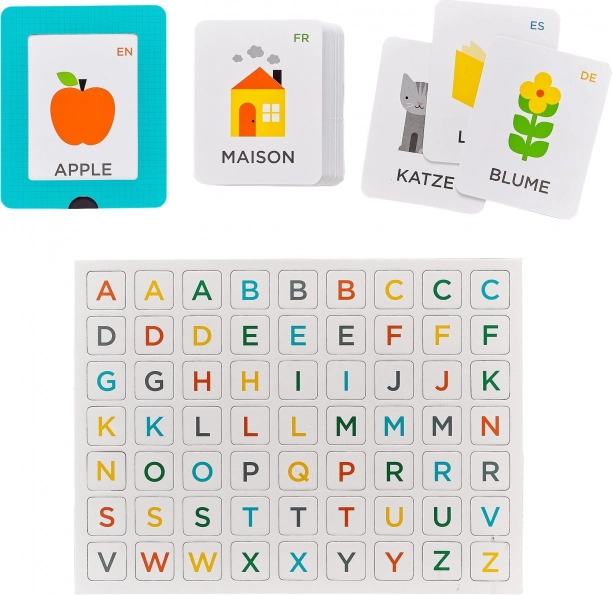 Opdag legende alfabetlæring med det flersprogede sæt fra Petit Collage. Børn bliver fortrolige med bogstaver og grundlæggende ordforråd på engelsk, tysk, spansk og fransk ved hjælp af overskuelige kort og magnetiske bogstaver, som er nemme at placere og bruge igen og igen.