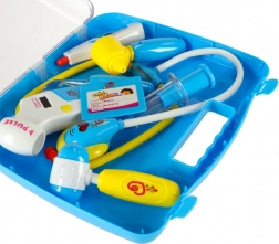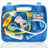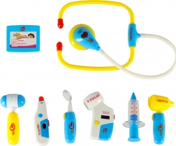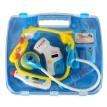 Sættet indeholder lægeredskaber som stetoskop, termometer, blodtryksmåler, øreværktøj, sprøjte, hammer, lægemærkat og værktøj til halskontrol med lys.