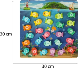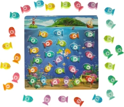 Gå ind i den magiske undervandsverden og oplev uendelig sjov med træ spillet til at fiske efter fisk. Dette pædagogiske spil hjælper børn med at lære bogstaver, farver og tal. Fiskene markeret med individuelle bogstaver skal matches til de rigtige huller, og du kan også fange dem med en magnetisk fiskestang. Hele processen hjælper med at udvikle koncentration og tålmodighed.