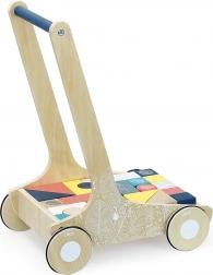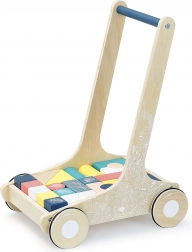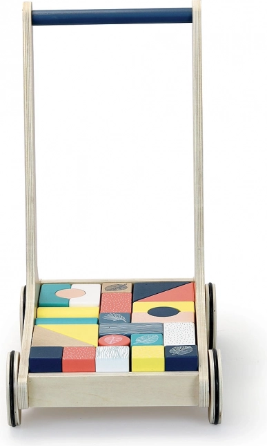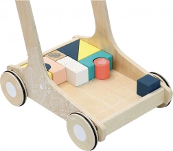 24 klodser i forskellige former er inkluderet i vognen, hvilket giver børn utallige muligheder for kreativ leg. Vognen har et moderne design med blåt håndtag og hvide illustrationer.