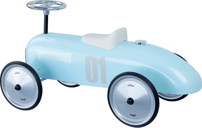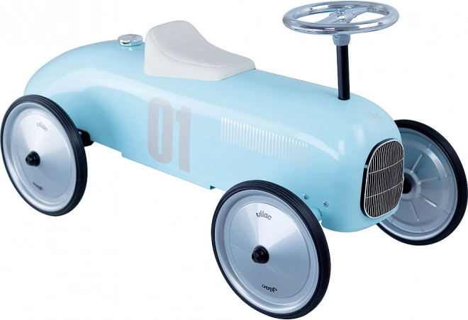 Oplev charmen ved klassiske racerbiler i børnestørrelse. Denne lyseblå metal-løbecykel inspireret af veteranbiler kombinerer tidløst design med sikker og komfortabel brug. De gummibelagte hjul sikrer stille kørsel selv på hårde overflader, mens rattet styrer drejning af forhjulene for naturlig manøvrering.