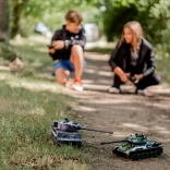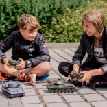Samtidig kørsel med begge kampvogne uden signaloverlap. Glidende joystick-styring frem/tilbage og præcis drejning på stedet.
