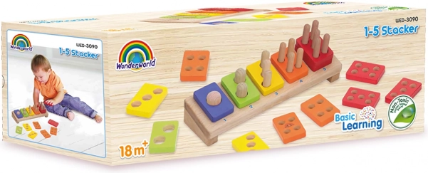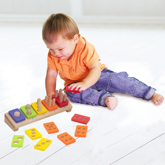 Dette kvalitets trælegetøj til læring hjælper børn med naturligt at genkende farver og forstå rækkefølgen af tallene 1–5. Hver plade har et tilsvarende antal huller, og børnene sætter dem på tappene i bundpladen, hvorved de øver tælling og logisk tænkning.