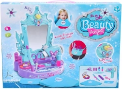 Dette stilfulde sminkebordssæt i turkis‑lilla farvekombination giver børn timevis af kreativ leg. Hovedattraktionen er et spejl med lys- og lydeffekter – når det aktiveres, afspiller det melodier, som forstærker stemningen under legen frisør- eller skønhedssalon.