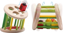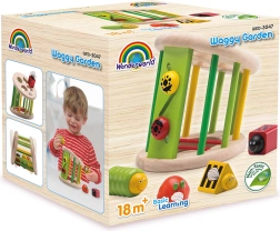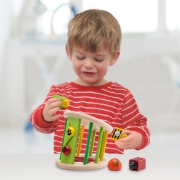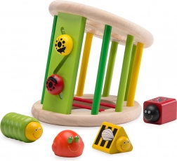 Multifunktionelt legetøj, der kombinerer indlægslegetøj og rasle. Børn kan kaste usædvanlige stykker af forskellige former og farver ind i buret, som repræsenterer forskellige typer af søde insekter fra haven. Indlægslegetøjet er let skrånet for at gøre det lettere for børnene at kaste stykkerne ind. På undersiden er det udstyret med et gummigitter, så stykkerne let kan fjernes. Legetøjet kan også bruges som en stor rasle, takket være formen der gør det muligt at rulle det. På siden er der også enkle glideelementer til træning af finmotorik. Det er lavet af holdbart krydsfiner og massivt træ og kombinerer kunstfærdigt både levende og naturfarver. Hovedegenskaber:buret og 4 dele til indlægslegetøjmultifunktionelt indsætning, rasle og skubberbehagelige afrundede former, der stimulerer taktil følsomhedholdbare trækonstruktionraffineret farve og overfladebehandling