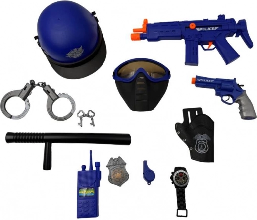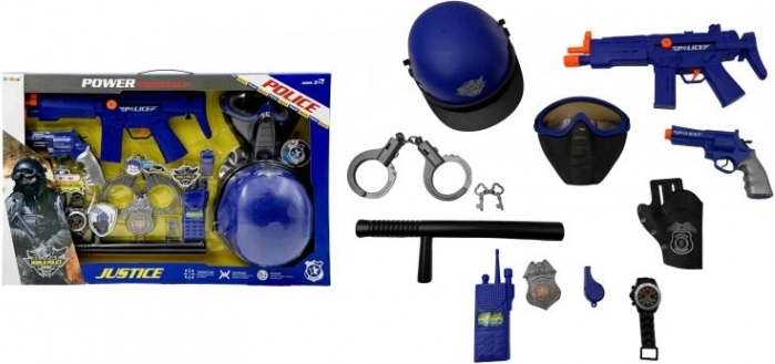 Bliv gadens helt med dette komplette politisæt! Sættet indeholder hjelm, pistol og andet tilbehør til realistisk politileg. For fuld funktion kræves 3× 1,5V AG13-batterier (medfølger ikke). En fantastisk gave til børn, der elsker actionfyldte eventyr og kreativ leg med realistiske lyde og effekter.