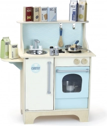 Stilfuldt legekøkken i blå, der begejstrer små kokke. Tilbyder solid trækonstruktion, klikbare komfurknapper, vask og ovn samt rigt tilbehør til realistisk leg. Velegnet fra 3 år.