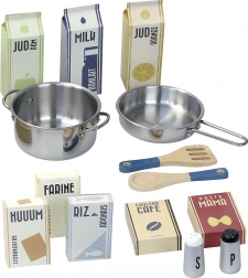 Køkken, kokkehue og forklæde, saltbøsse, peberbøsse, røreske, gryde, pande, kartoner med “madvarer”