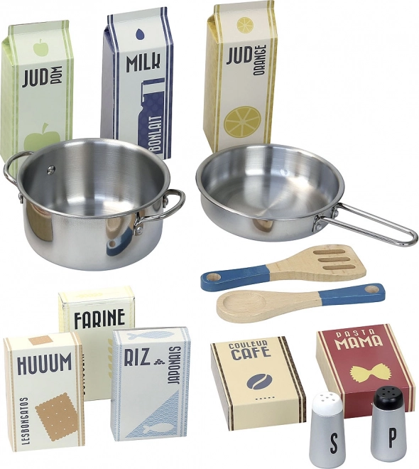 - Køkken, kokkehue og forklæde, saltbøsse, peberbøsse, røreske, gryde, pande, kartoner med “madvarer”