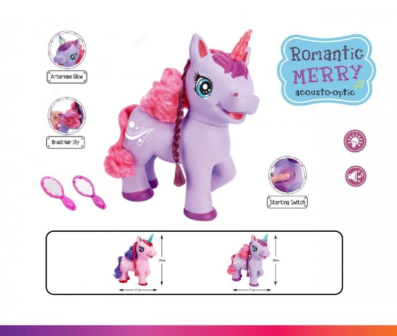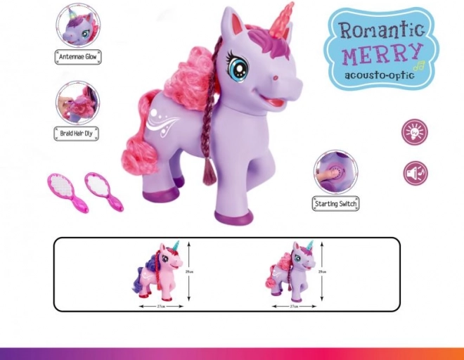 Den søde lilla enhjørning på batteri vil glæde børn med sine effekter – når man trykker på knappen på maven, begynder den at synge en engelsk sang, den udsender magiske lyde, og dens horn lyser. Der medfølger en kam og et spejl til at rede den lange manke.