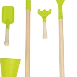- Sættet indeholder en rive, en hakke, en plastik blomsterpotte, en skovl og en kultivator.