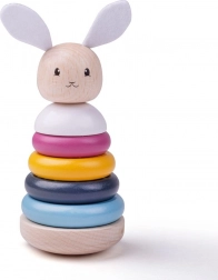 Denne kvalitets træstabler i pastelfarver er et ideelt første læringslegetøj. Børn stabler ringene fra størst til mindst, styrker hånd-øje-koordination og lærer at skelne farver og former. De tekstile ører og halen på kaninen tilføjer en taktil dimension til legen.