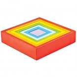 Regnbuepaletten og de gradvist mindre firkanter hjælper børn med at skelne farver, størrelser og former. Ideelt til den første sortering og navngivning.