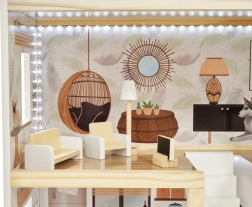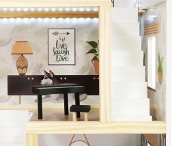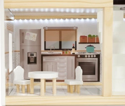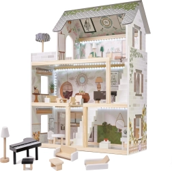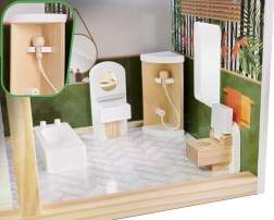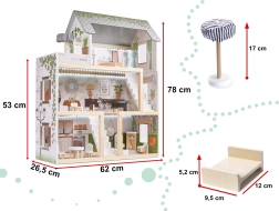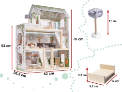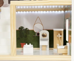 Trædukkehuset LULILO Floro er designet i boho-stil, hvilket gør det ikke bare smukt, men også funktionelt. Med sine tre etager og den rummelige terrasse tilbyder det masser af plads til forskellige scenarier og lege. Huset er udstyret med fire rum: køkken, badeværelse, stue og soveværelse, hvor hvert rum er rigt udstyret som i et rigtigt hjem.