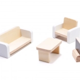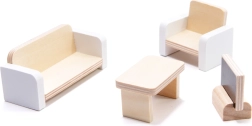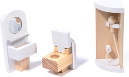 I pakken finder du 16 møbeldele: bord, stole, seng, lampe, lænestol, sofa, sofabord, tv, klaver, bænk, liggestol, parasol, bruser, håndvask og toilet.