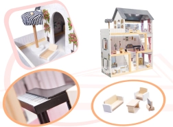 Stilfuld dukkestue i MDF-træ i elegant sort farve med tre etager fulde af sjov, et rigt sæt møbler og stemningsfuld LED-belysning. Takket være den solide MDF-konstruktion er den stabil og holdbar, mens 16 møbeldele gør det muligt kreativt at indrette køkken, stue, soveværelse, badeværelse og tagterrasse.