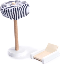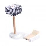 Tagterrassen med liggestol og stribet parasol er ideel til dine dukkers afslapning og fuldender realistiske hverdagsscener.