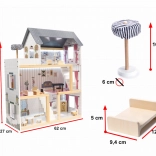Der medfølger rigt tilbehør, inklusive møbler til stue, soveværelse, køkken og badeværelse samt terrasse med liggestol og parasol. Huset er en fantastisk gave til børn fra 3 år, miniatureentusiaster og fotografer.