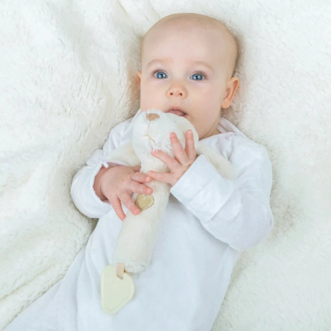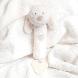 Denne alsidige, bløde legetøjs-hund giver barnet tre oplevelser i ét: blid raslen til at stimulere hørelsen, sjov pivelyd ved tryk og et tekstureret bidelegetøj for lindring ved tandfrembrud. Den neutrale, naturlige tone passer i enhver babyudstyrssamling.