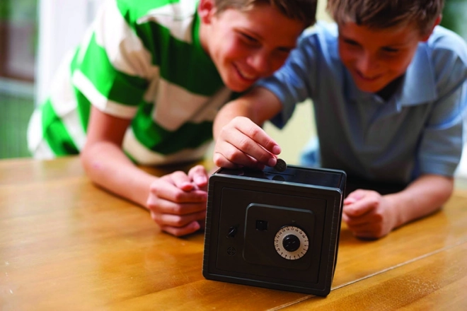 Lær og hav det sjovt samtidig. To børn leger med pengeskabet, hvilket viser dets læringsmæssige værdi.