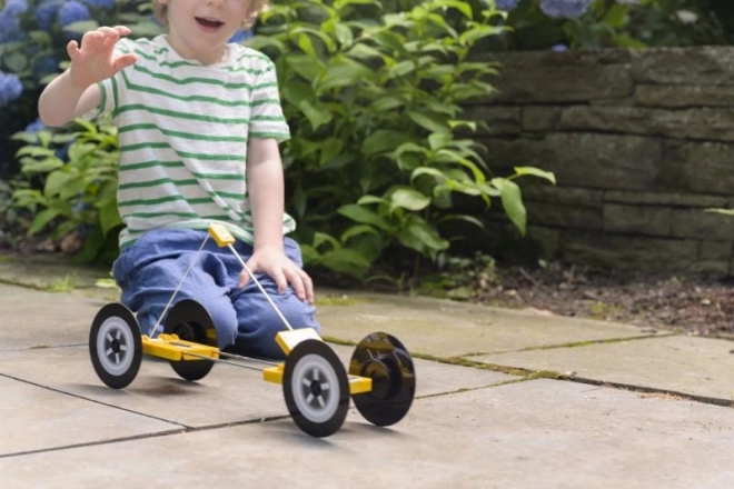 Bilen er lavet af let og holdbart plastmateriale, ideel til udendørs brug. Det enkle design og de store sorte hjul gør den nem at håndtere og leverer den drivmekanisme, der er hjertet i denne smarte konstruktion.