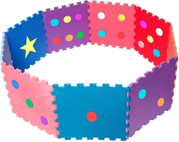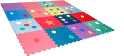 Livlige farver og former (prikker, stjerne) stimulerer sanserne og udviklingen af fin- og grovmotorik. Skummet dæmper stød og beskytter mod gulvkulde.