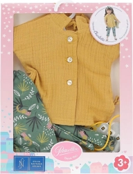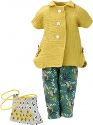 Elegant sæt tøj til PETITCOLLIN Finouche-dukker i størrelsen 48 cm. Indeholder en okkerfarvet bluse, grønne bukser med tropisk mønster, stilfuld taske og matchende hårbøjle. Kvalitetsforarbejdning, fransk elegance og uforveksleligt design vil glæde enhver lille stylist.