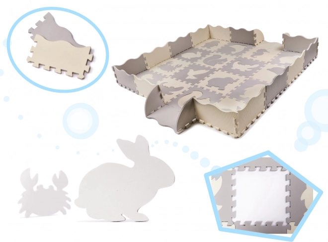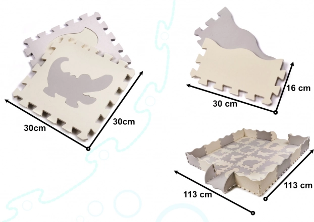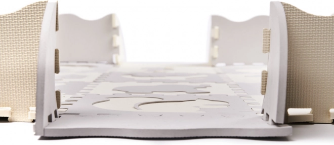 Blød børnemåtte af skumpuslespil med udtagelige former skaber et sikkert og kreativt legeområde. Takket være de forhøjede kanter kan du samle en legegård, som holder legetøjet indenfor. Måtten er vandafvisende, har en skridsikker overflade og dæmper stød perfekt, så den er ideel til de første skridt. Den neutrale grå og ecru farve passer ind i enhver indretning.