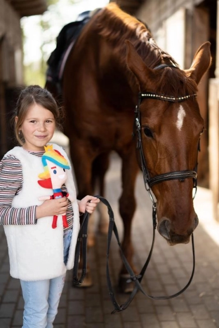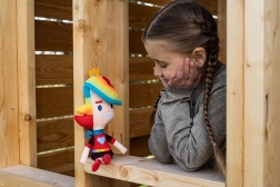 Med regnbuefarvede accessories og et venligt smil giver den børn en følelse af glæde og tryghed.