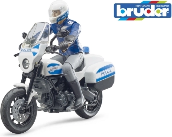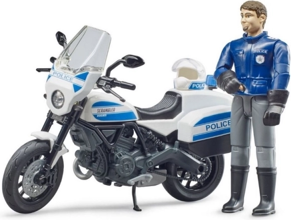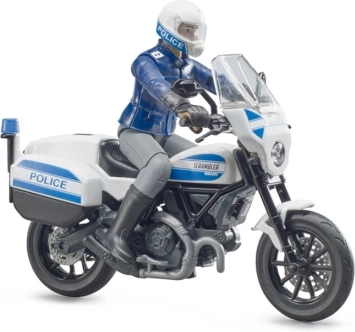 Politimotorcyklen DUCATI Scrambler fra Bruder er en gennemarbejdet model for både små og store fans af beredskabet. Motorcyklen har dreiestyr for nem manøvrering og en nedklappelig støttefod for stabil parkering. Politifiguren har bevægelige led, så den kan placeres i kørestilling eller stå ved siden af maskinen.