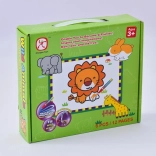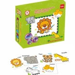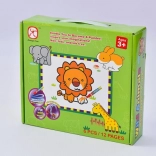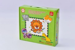 Indsætningspuslespil Dyr og vandmaling er den ideelle kombination til udvikling af fantasi og finmotorik. Børn kan glæde sig over seks forskellige billeder – kanin, elefant, giraf, løve, zebra og tiger.