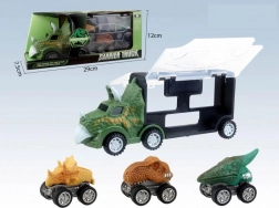 Oplev den unikke dinosaur-lastbil, der glæder hvert barn med kombinationen af dinosaurer og biler. Trækkeren i dinosaurform imponerer ved første øjekast, og de medfølgende 3 pull-back-biler sørger for dynamisk leg derhjemme og på farten.