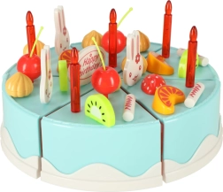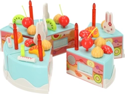 Dette farverige sæt med en blå fødselsdagskage er ideelt til fødselsdagsleg og legekøkken. Kagen består af 6 stykker forbundet med burrebånd, så børnene kan skære den med den medfølgende plastkniv, omarrangere den og pynte igen. Det rige tilbehør – fra lys og frugt til søde kaniner og skiltet 'Happy Birthday' – stimulerer kreativitet og udvikling af fantasi.