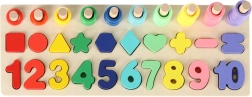 Denne montessori-sæt forener byggeglæde med læring. Børn placerer trægeometriske former og tal i de rigtige huller og trækker samtidig farvede ringe på pinde, hvor antallet svarer til det pågældende tal. Med den overskuelige træbase bliver læring naturlig og sjov.
