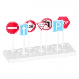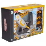 Sættet indeholder tre gule byggemaskiner – gravemaskine med bevægelig arm, betonblander og bulldozer – plus 7 trafikskilte. Alt passer ind i flyet. Legetøjet har aftagelige vinger for at spare plads og et håndtag for nem transport.