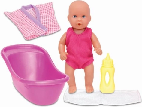 Dukken drikker og tisser er det ideelle legetøj for små forældre. Sættet indeholder badeudstyr, herunder flaske, lille badekar, håndklæde og badekåbe.