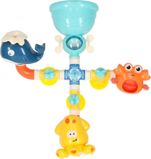 Det sjove badebyggesæt med rør og havdyr forvandler hvert bad til leg og kreativitet. Hæld vand i tragten øverst, og se det løbe gennem rørene, sætte hjul i gang og skabe vandfald og små fontæner. Med sugekopperne kan legetøjet nemt fastgøres på badekarret eller fliserne. Udvikler finmotorik, lærer årsag og virkning og styrker kreativiteten ved at bygge egne vandbaner.