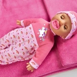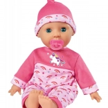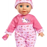 Dukken er klædt i en lyserød dragt med enhjørningemotiv, hvilket gør den til et yndigt legeobjekt for børn.