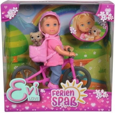 Den søde dukke Evička er klar til en cykeltur – hun har både en cykelhjelm, en smart cykel og en trofast hund i rygsæk. En ideel legeting til børn fra 3 år, der støtter fantasi og bevægelseslege.
