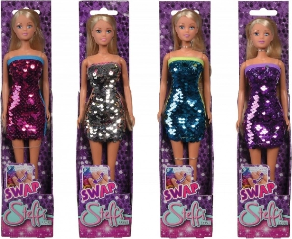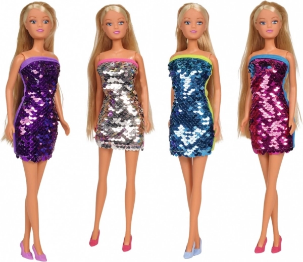 Dukke Steffi i kjole med farvede pailletter med swap-effekt. Størrelse 29 cm.