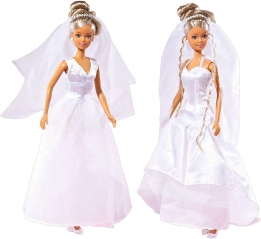 Den charmerende dukke Steffi som brud i en elegant brudekjole med slør vil glæde børn, der elsker mode og historier. Takket være højden på 29 cm og de bevægelige arme er den ideel til kreativ bryllupsleg og til at skabe dine egne romantiske scener.