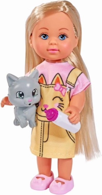 Oplev magien ved omsorgslege med dukken Evi Love, som bærer en kjole med et muntert kattemotiv. Hver pakke indeholder også en sød killing og en flaske, som hjælper børn med at udvikle fantasi, empati og finmotorik.