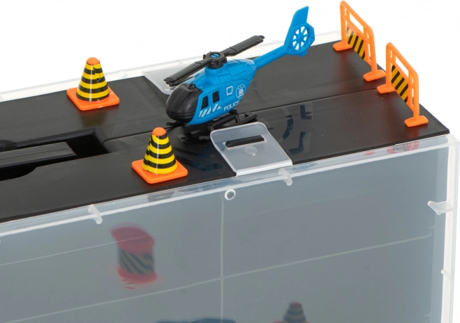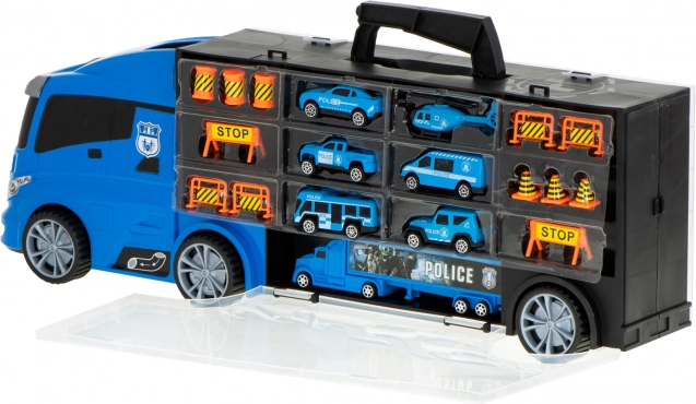 Sættet indeholder 6 detaljerede metalpolitivogne og en helikopter, suppleret med trafikelementer til spændende scener. Transportøren rummer op til 26 småbiler, så der er masser af plads til flere samlerstykker.