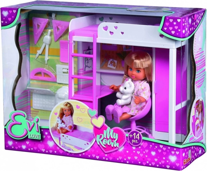 Den søde dukke Evi Love nyder sit stilfulde lille værelse med hemseseng, skrivebord og masser af tilbehør. Sættet i hvid‑lyserød med hjerte-motiver indeholder en stol, laptop, rygsæk, skoleting og en nuttet enhjørning. Ideelt til kreativ leg og historiefortælling for børn fra 3 år.